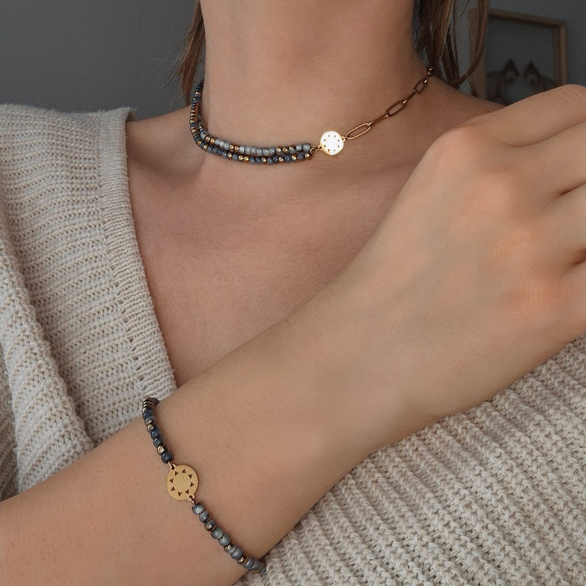 Направи впечатление с дръзката гривна Mini Sun, където слънцето среща ясното небе в хармоничен и впечатляващ дизайн. В центъра блести висулката Mini Sun, сърцето на колекцията. Мънистата от 4 мм в синьо-златисти тонове съчетават тъмно синьо-сиво-златисто с по-светло синьо-сиво-златисто, създавайки лек, непринуден контраст.