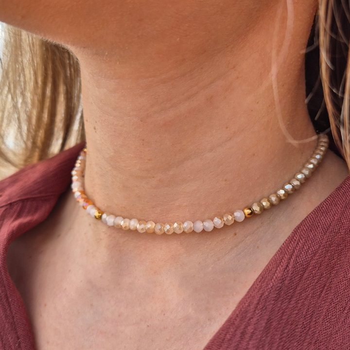 Колието Шампанско съчетава нежни стъклени мъниста с елегантни елементи от неръждаема стомана.