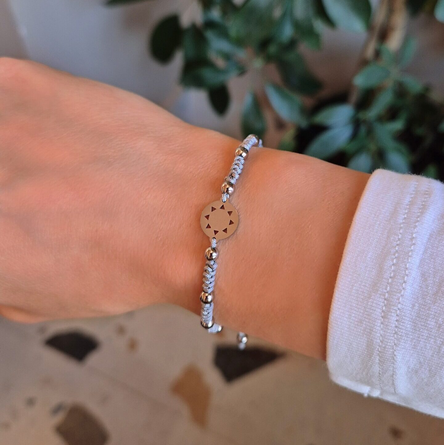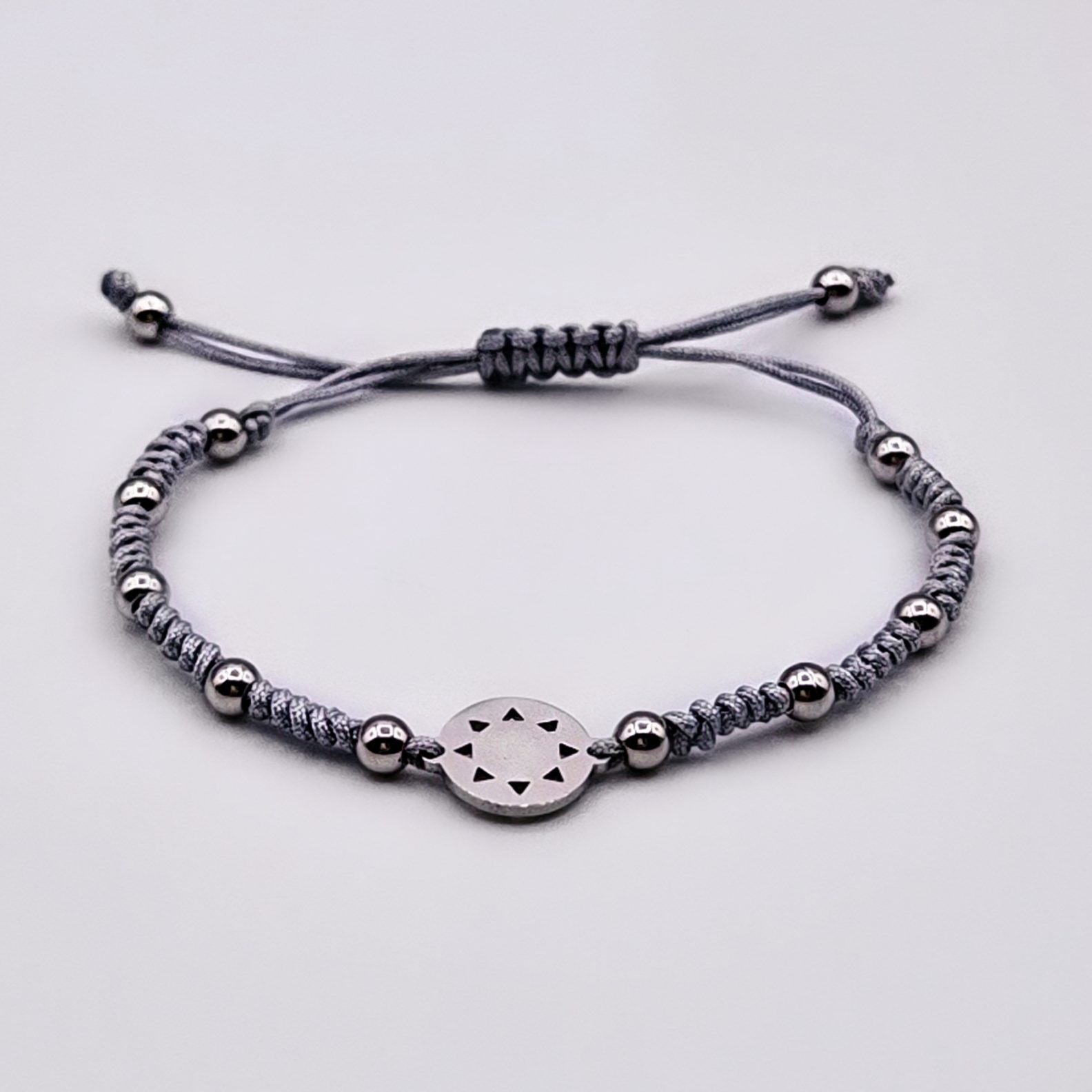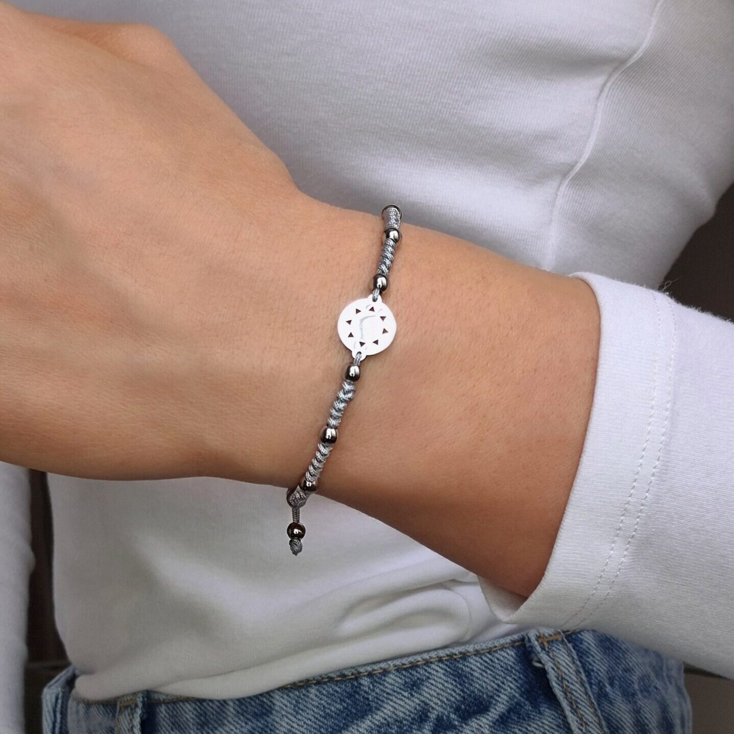 В центъра на тази гривна е висулка със слънце, емблематична за колекцията Mini Sun. Стоманените мъниста са разположени между ръчно изработени възелчета, които придават непретенциозен и леко небрежен чар на гривната. Дизайнът с плъзгащ се възел позволява регулиране и удобство, а гривната стои чудесно както самостоятелно, така и в комбинация с други бижута.