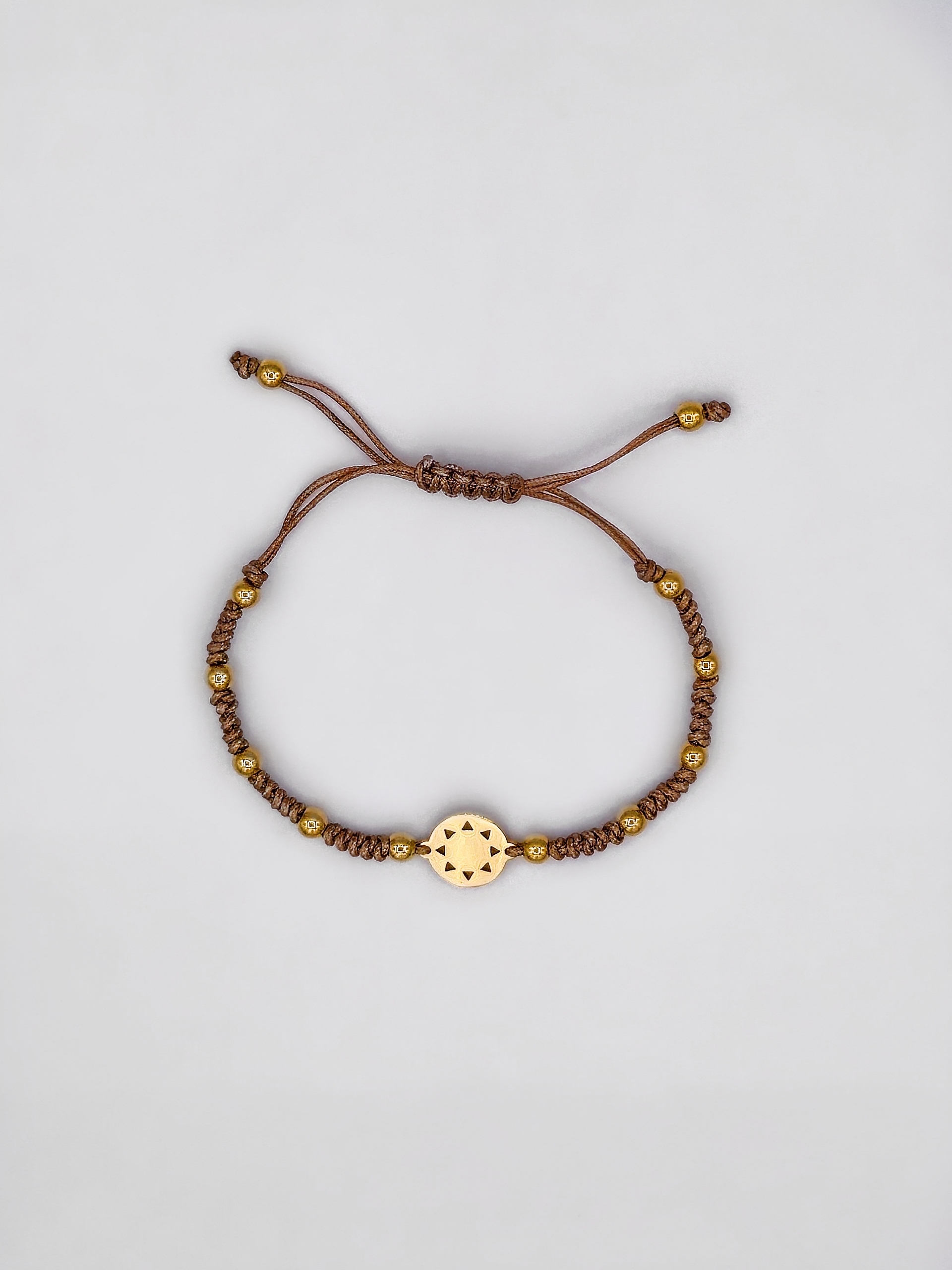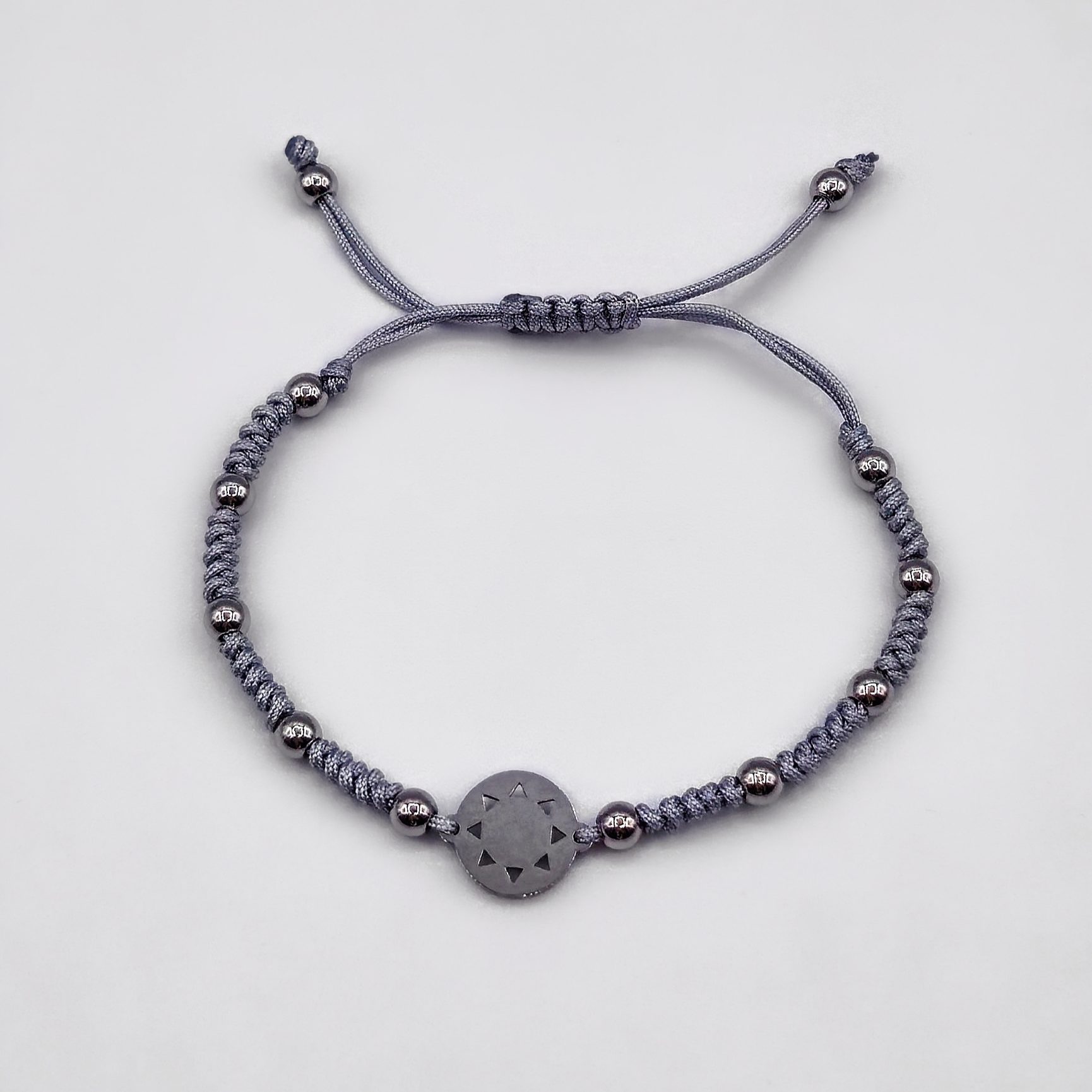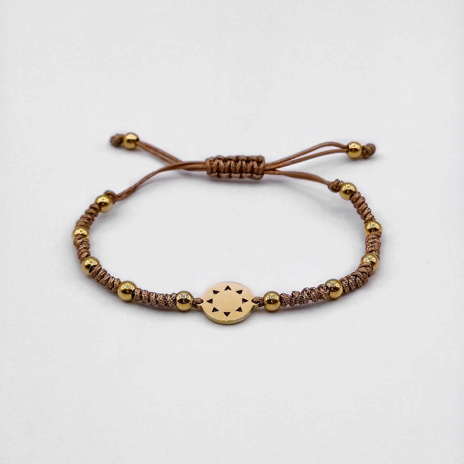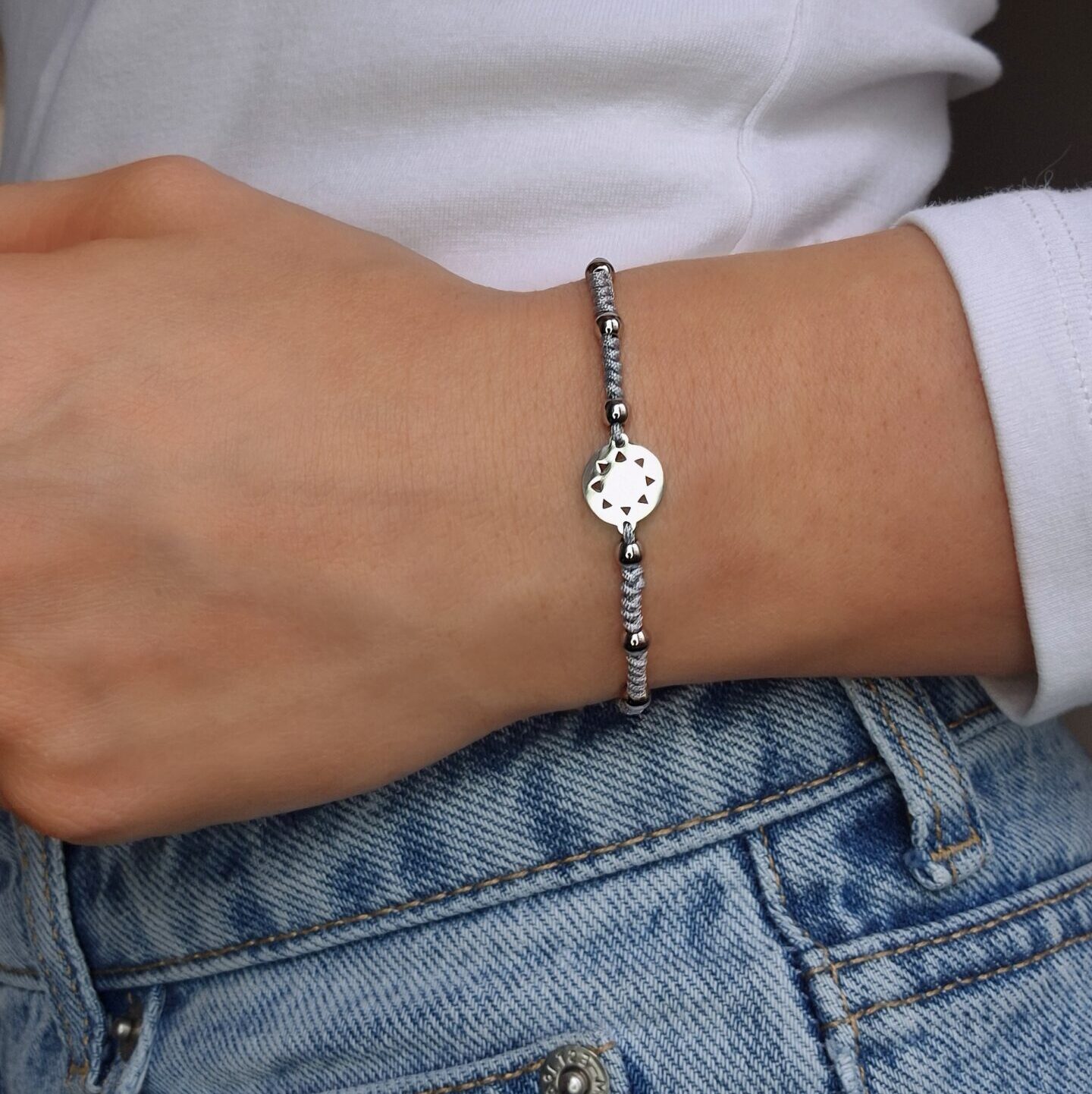 В центъра на тази гривна е висулка със слънце, емблематична за колекцията Mini Sun. Стоманените мъниста са разположени между ръчно изработени възелчета, които придават непретенциозен и леко небрежен чар на гривната. Дизайнът с плъзгащ се възел позволява регулиране и удобство, а гривната стои чудесно както самостоятелно, така и в комбинация с други бижута.