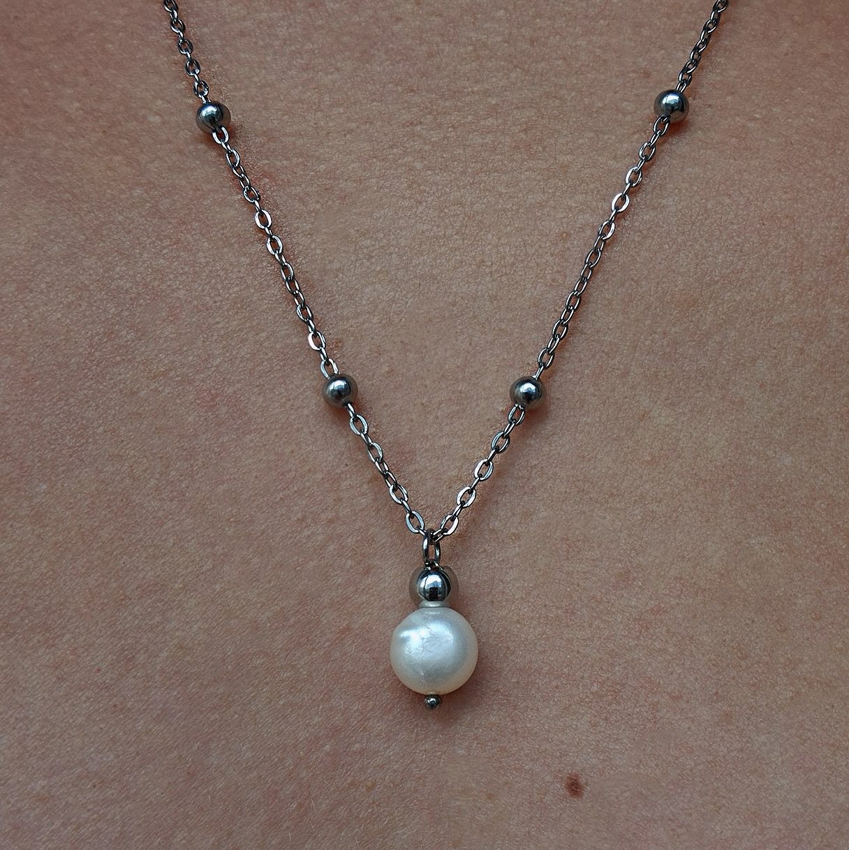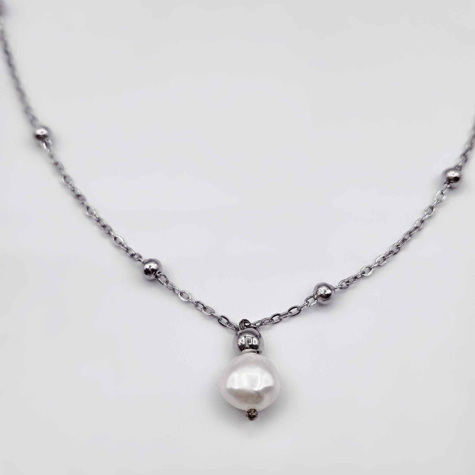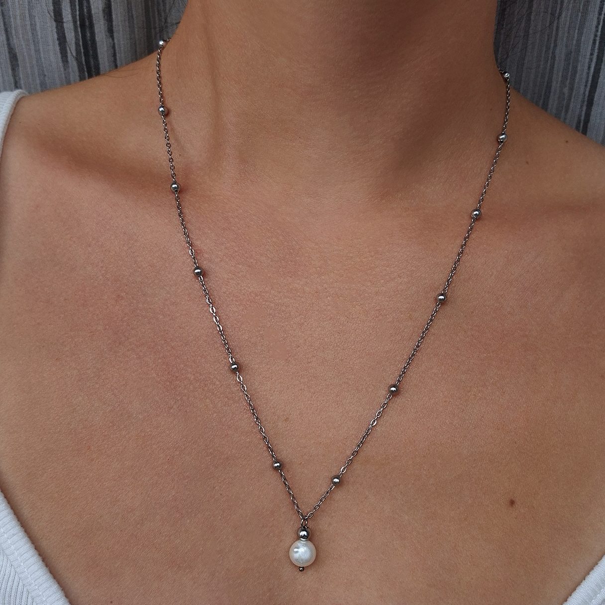 Модерна интерпретация на класиката. Колието съчетава висулка от речна перла и верижка с ефектни мъниста от неръждаема стомана. Подходящо е за всеки ден и можеш да го носиш самостоятелно или да го комбинираш с любимите си чокъри от Ray.