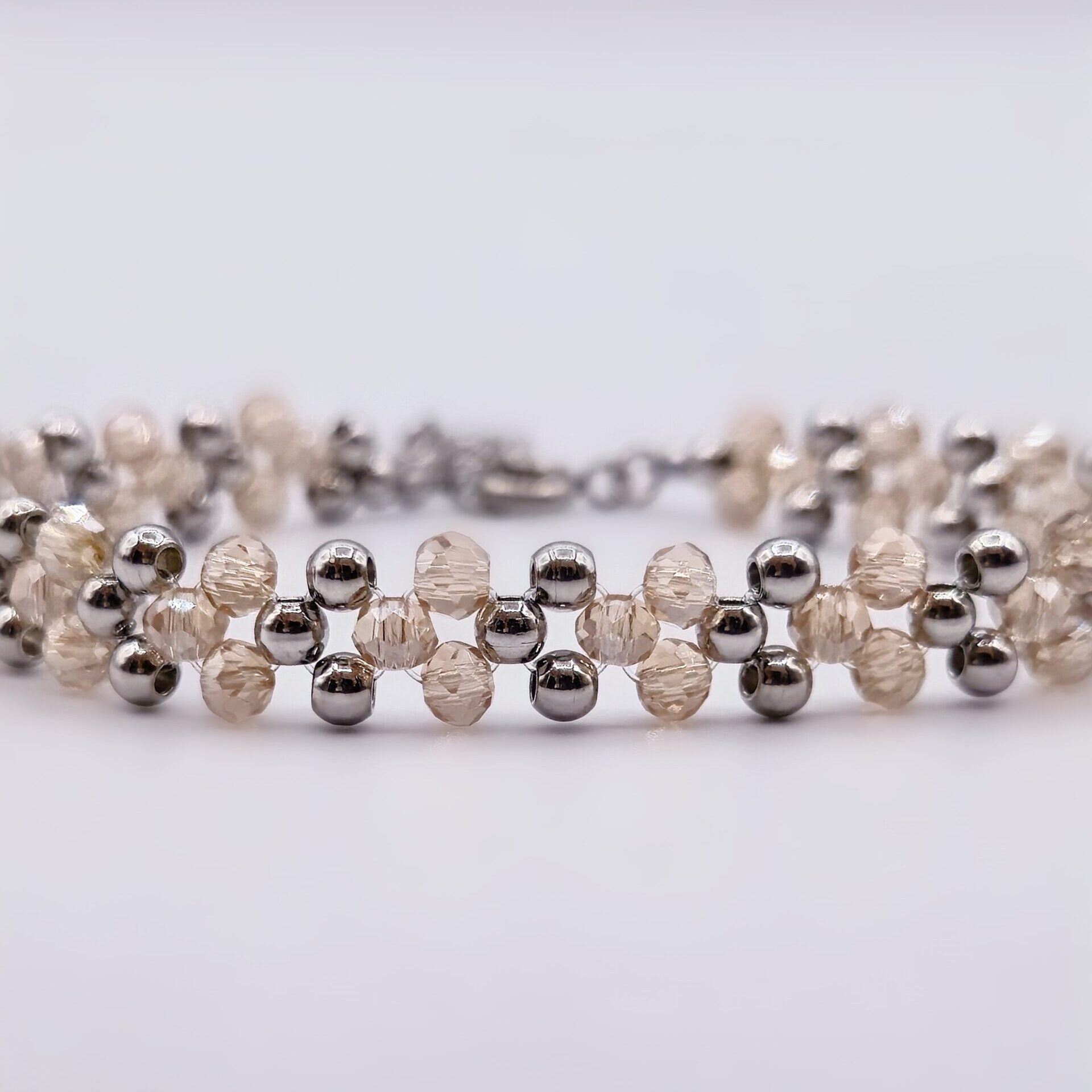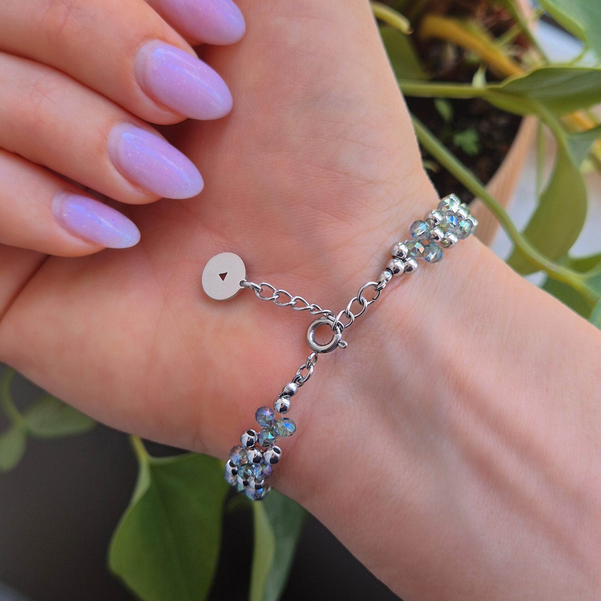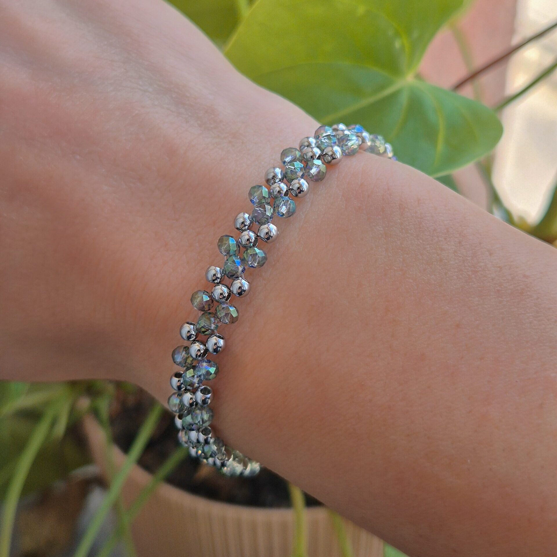 A repeating pattern of triangles for a clean, geometric design that combines stainless steel and faceted glass beads. Glass catches the light with subtle movement., while the stainless steel elements add structure, giving the bracelet a sharper, more architectural feel. The bracelet is finished off with a mini triangle pendant – a subtle symbol historically associated with feminine energy and creation. The Axis Bracelet explores another side of femininity: defined, intentional, and strong. A striking accent that transitions effortlessly from everyday wear to special occasions.
