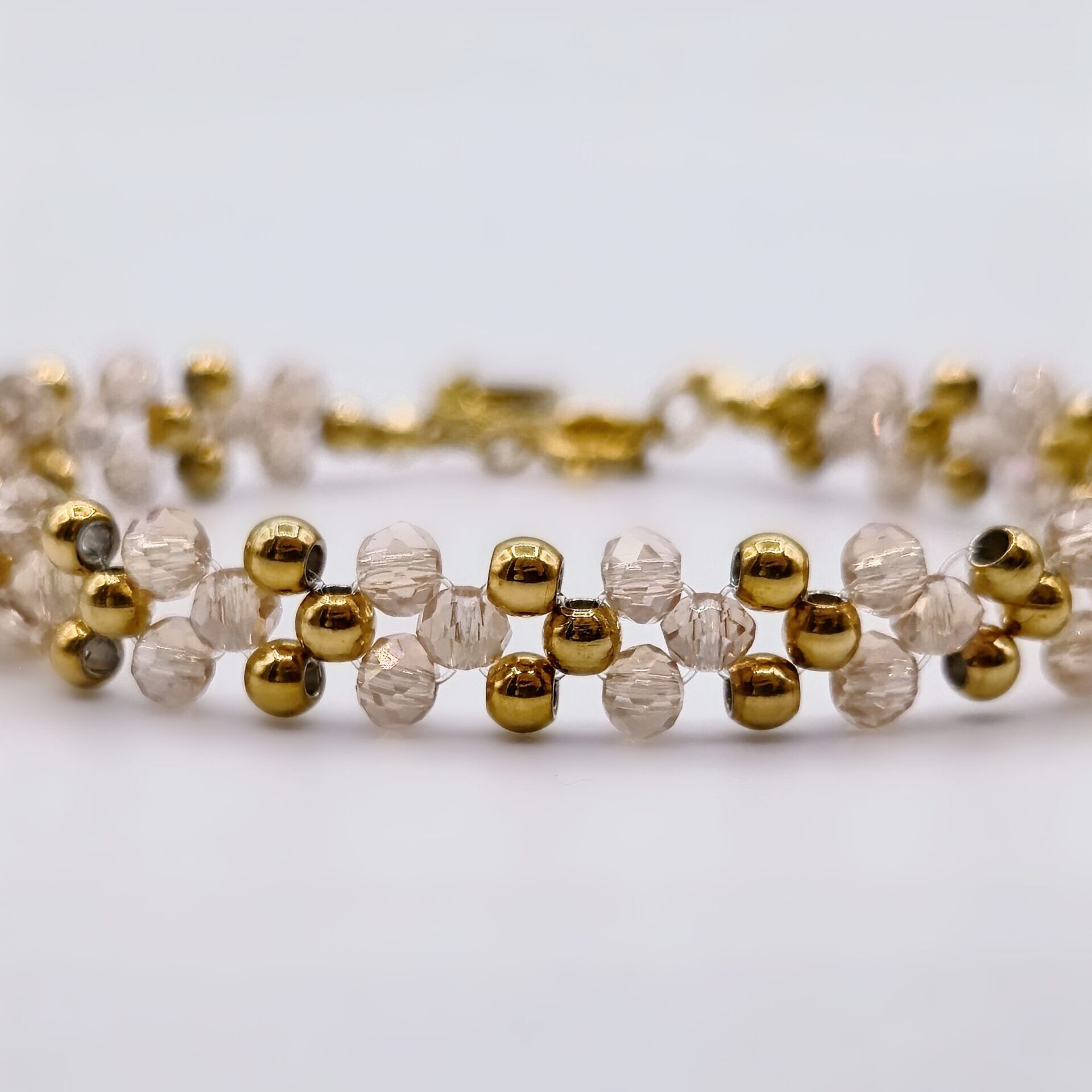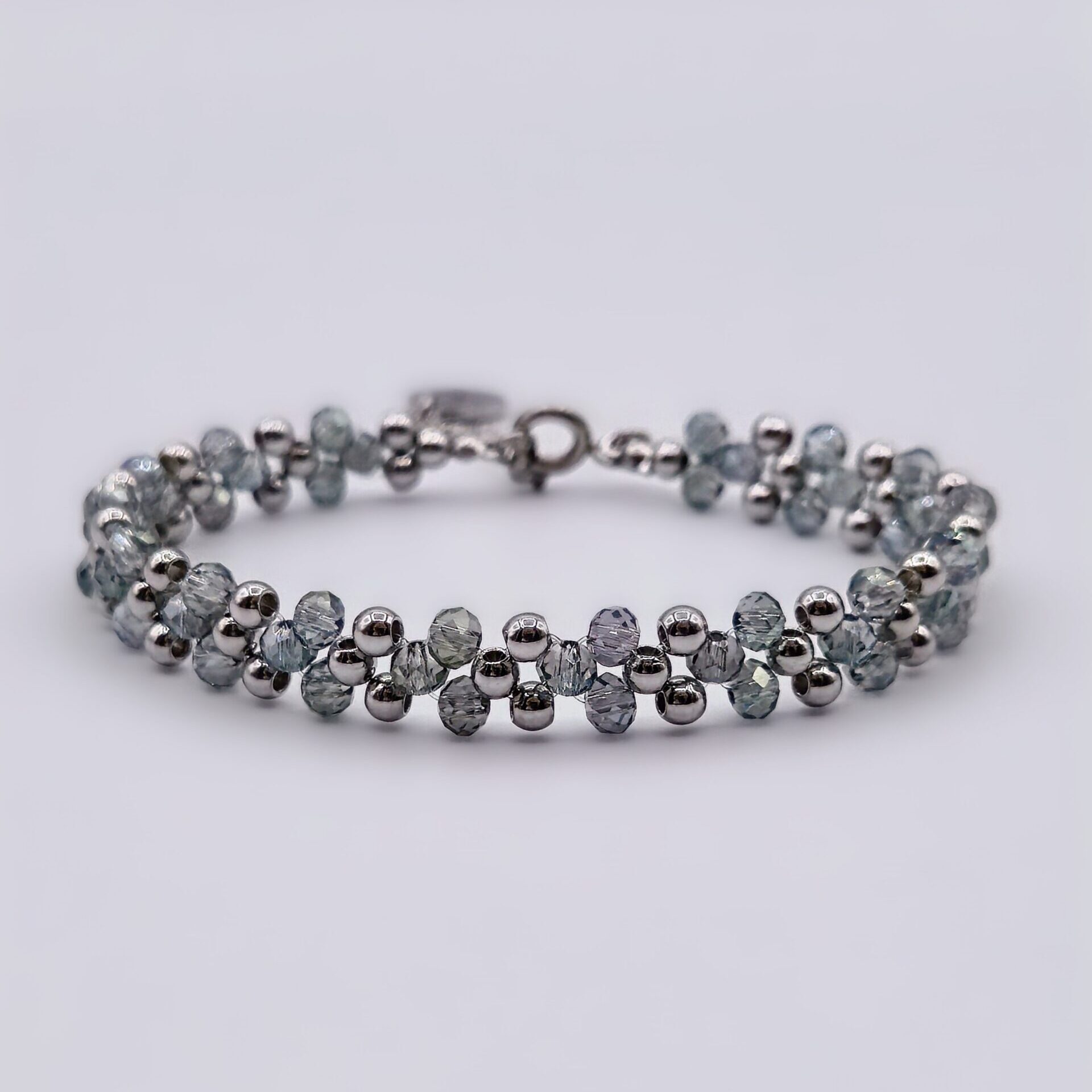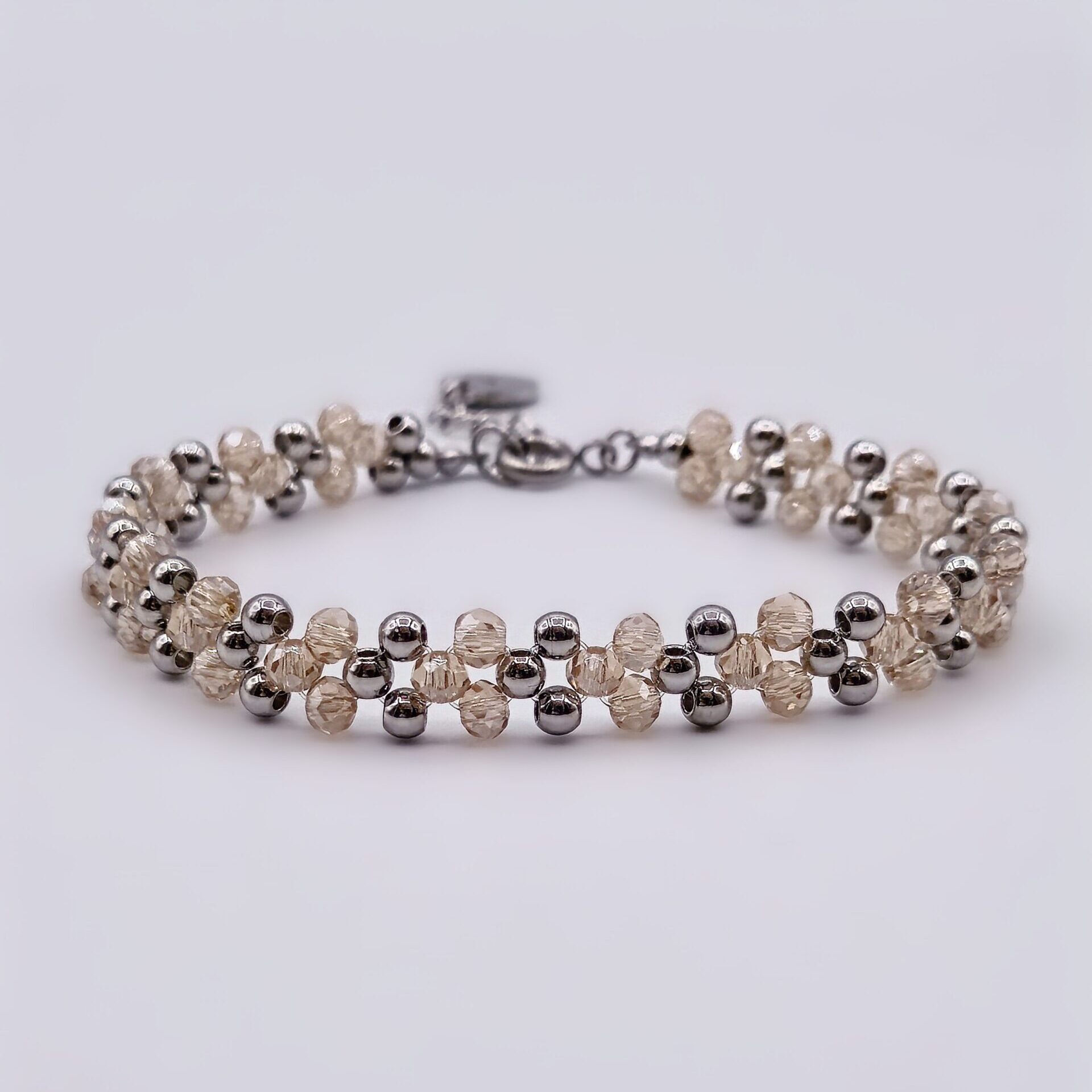 A repeating pattern of triangles for a clean, geometric design that combines stainless steel and faceted glass beads. Glass catches the light with subtle movement., while the stainless steel elements add structure, giving the bracelet a sharper, more architectural feel. The bracelet is finished off with a mini triangle pendant – a subtle symbol historically associated with feminine energy and creation. The Axis Bracelet explores another side of femininity: defined, intentional, and strong. A striking accent that transitions effortlessly from everyday wear to special occasions.