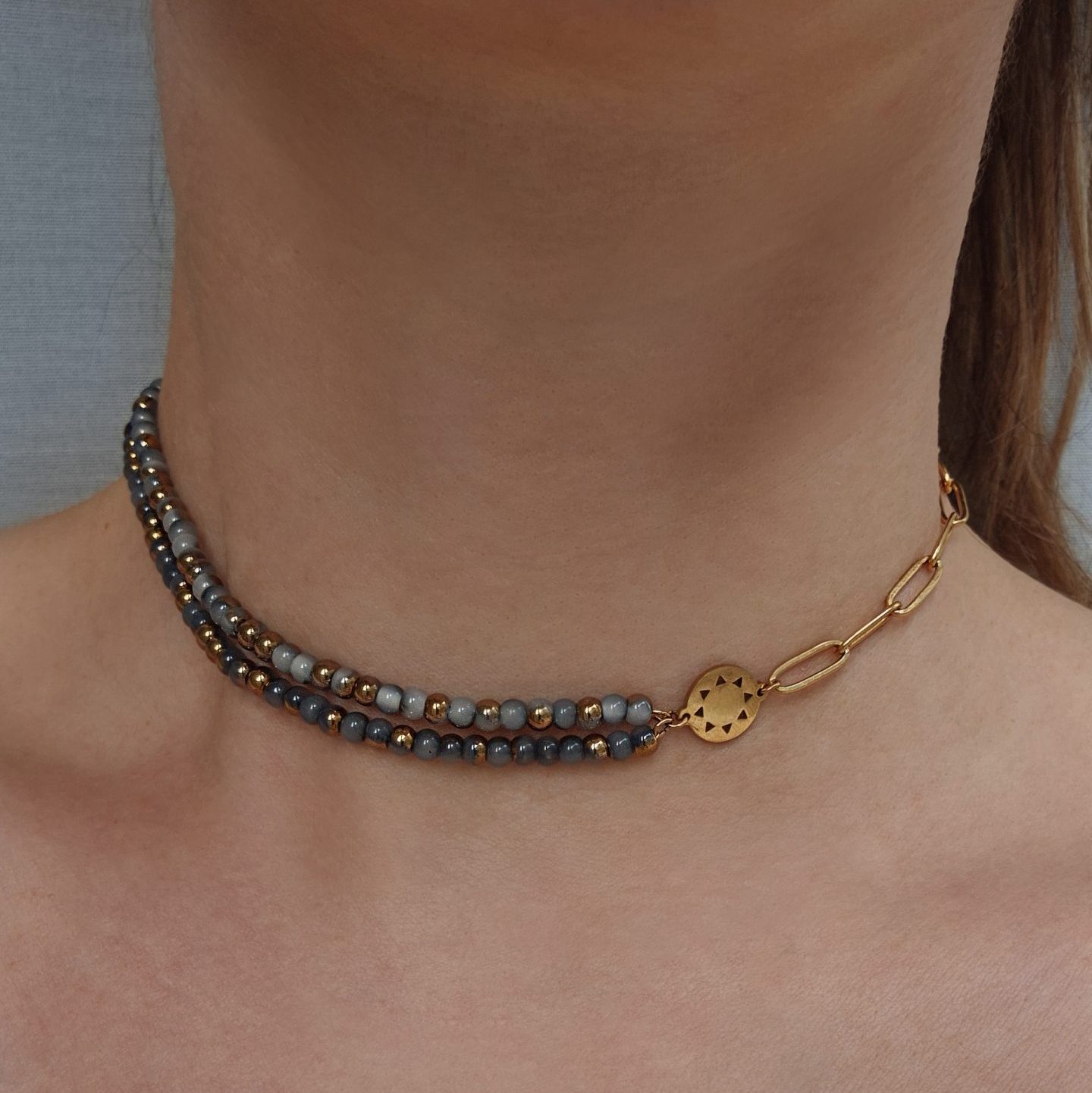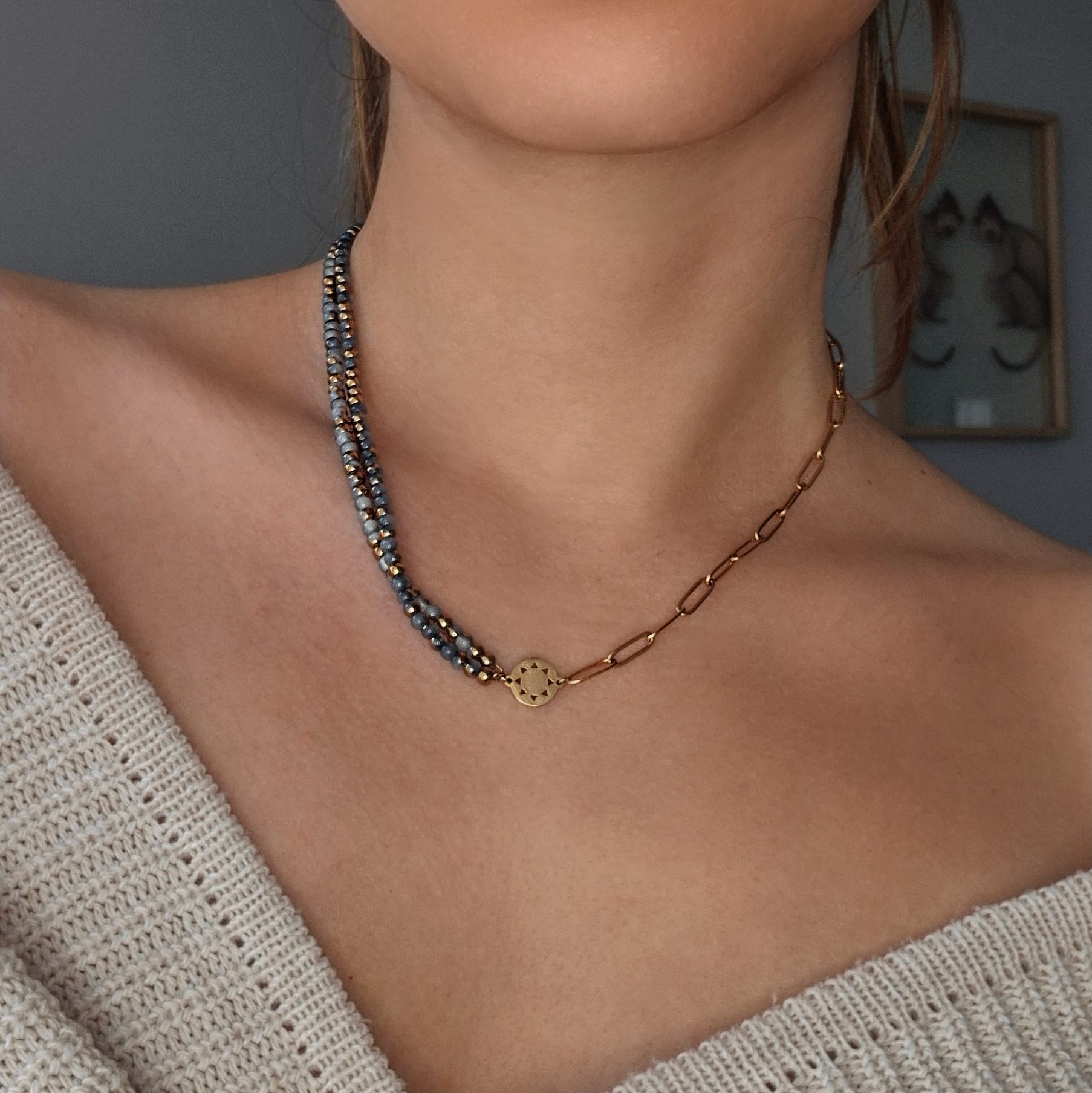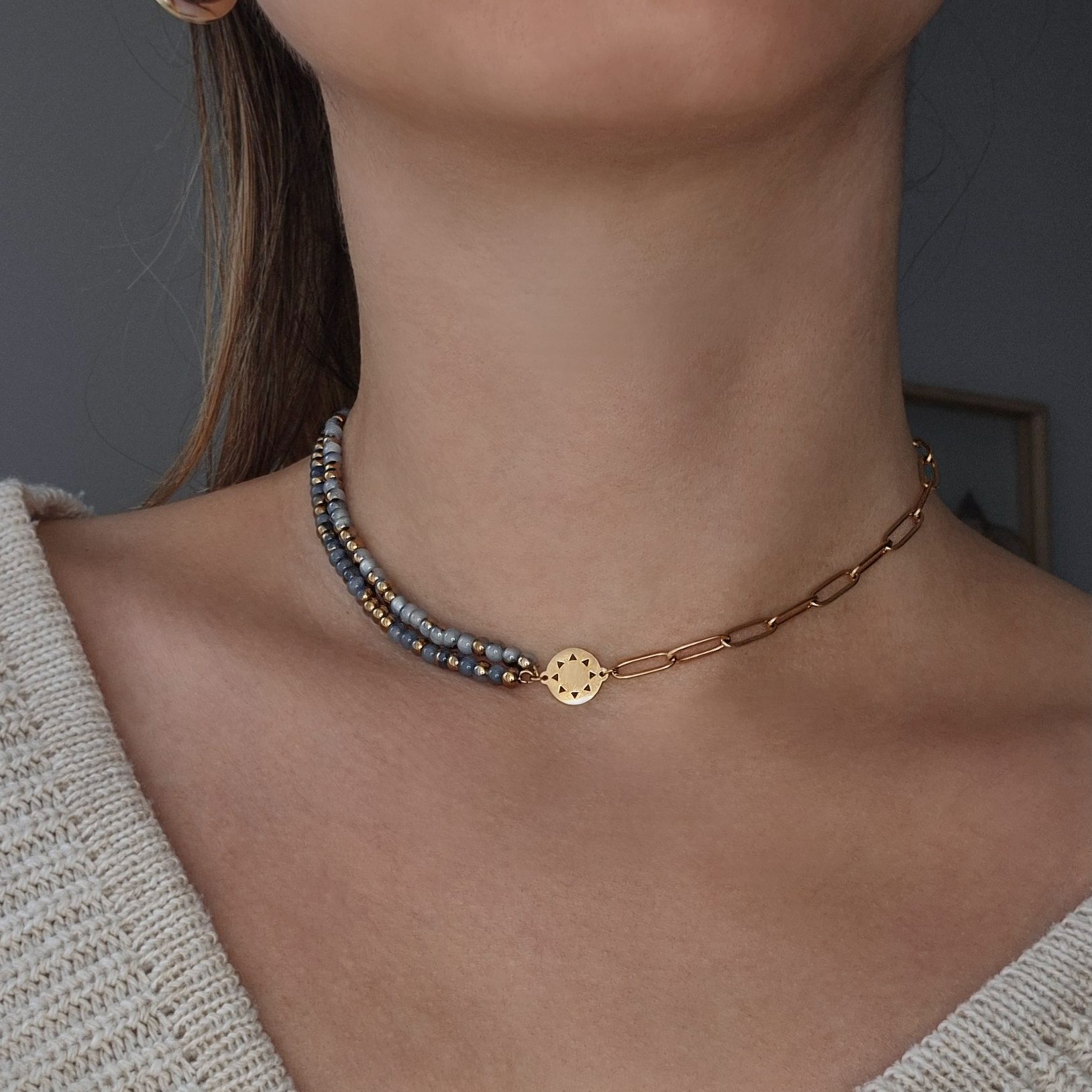 Elevate your look with the Bold Mini Sun Necklace, where the sun meets the sky in one striking piece. The necklace features a half square wire chain and half layered blue-gold glass beads, creating a versatile design that can be worn as a necklace or as a choker. At its center sits the mini sun pendant, the signature of the Mini Sun collection.