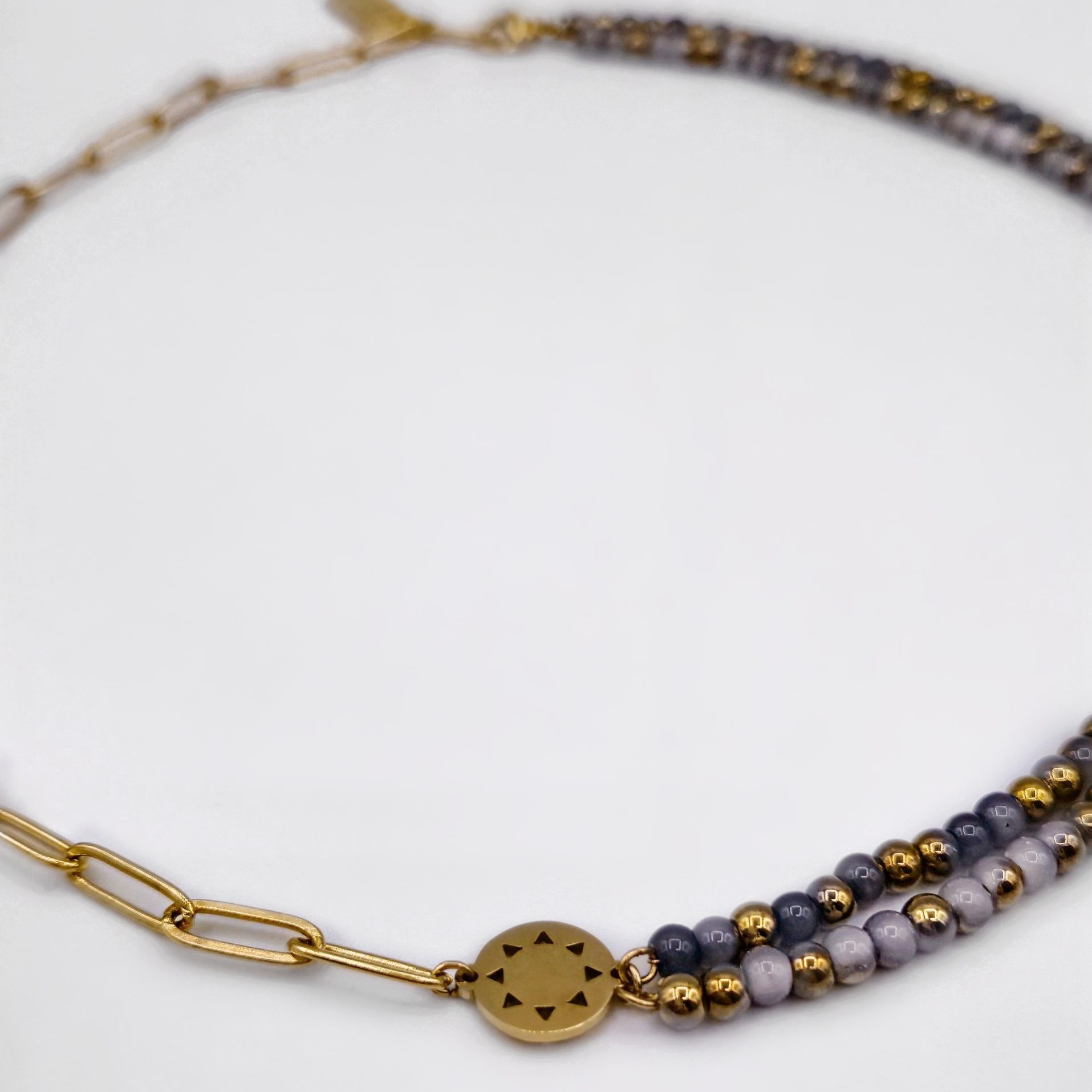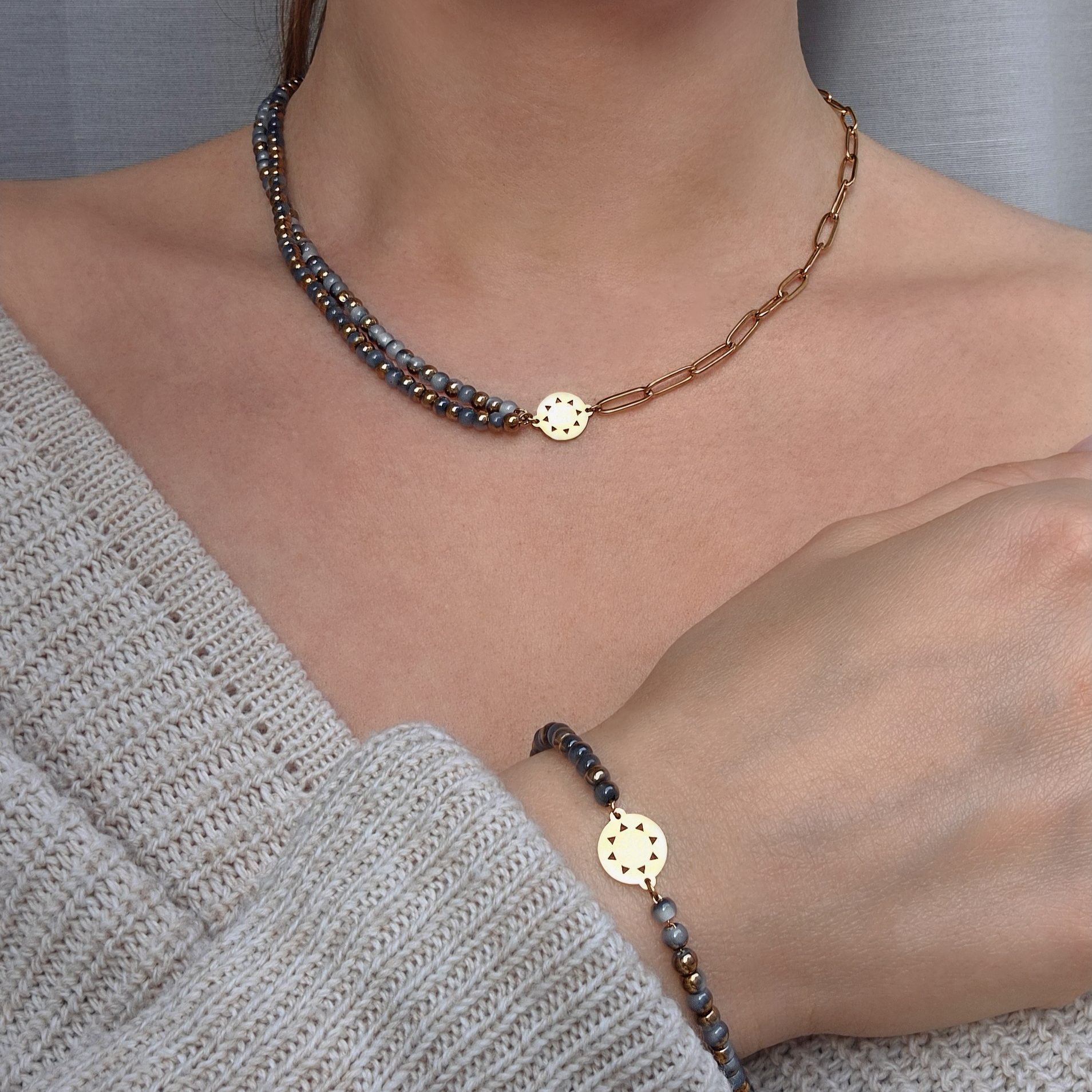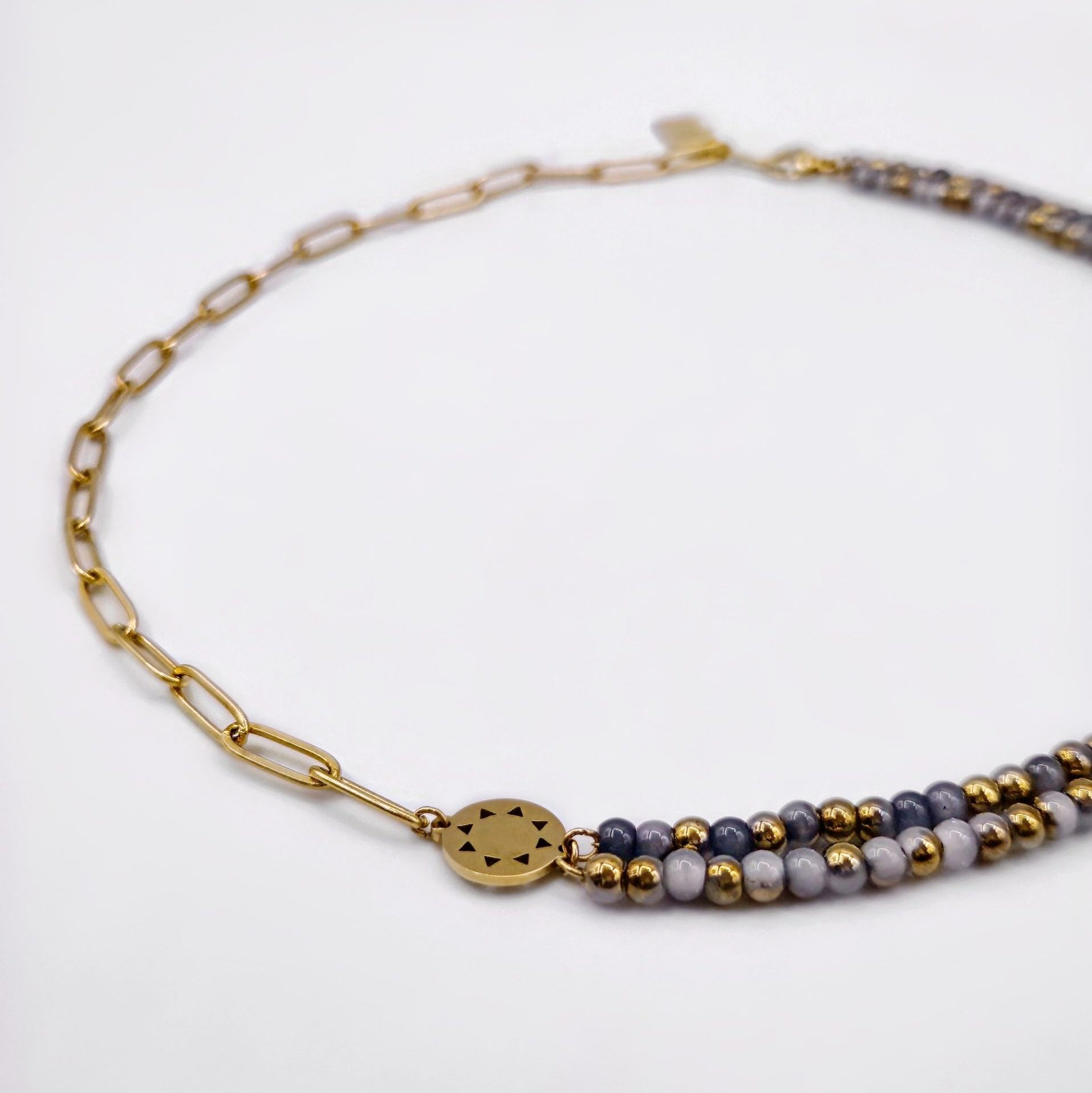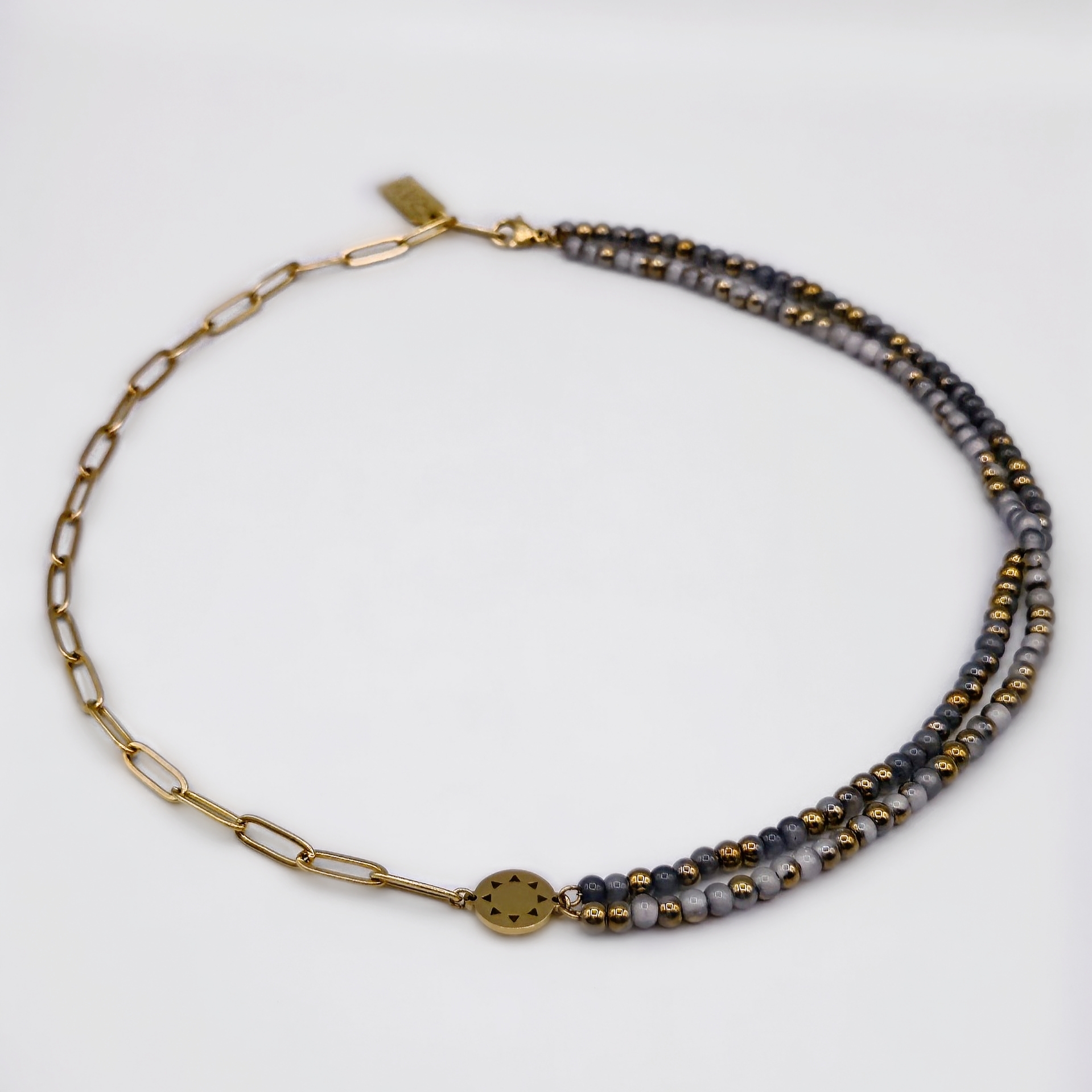 Elevate your look with the Bold Mini Sun Necklace, where the sun meets the sky in one striking piece. The necklace features a half square wire chain and half layered blue-gold glass beads, creating a versatile design that can be worn as a necklace or as a choker. At its center sits the mini sun pendant, the signature of the Mini Sun collection.