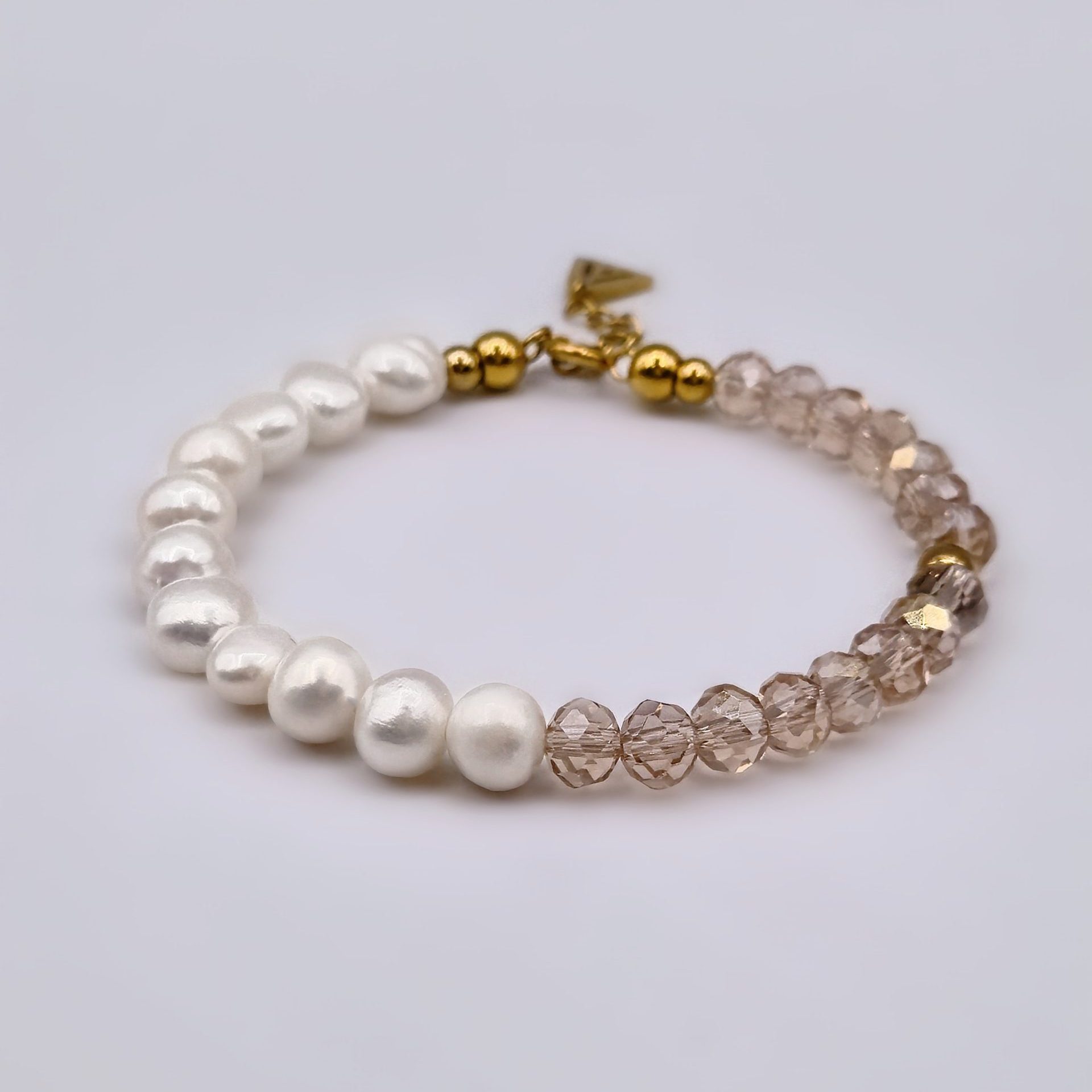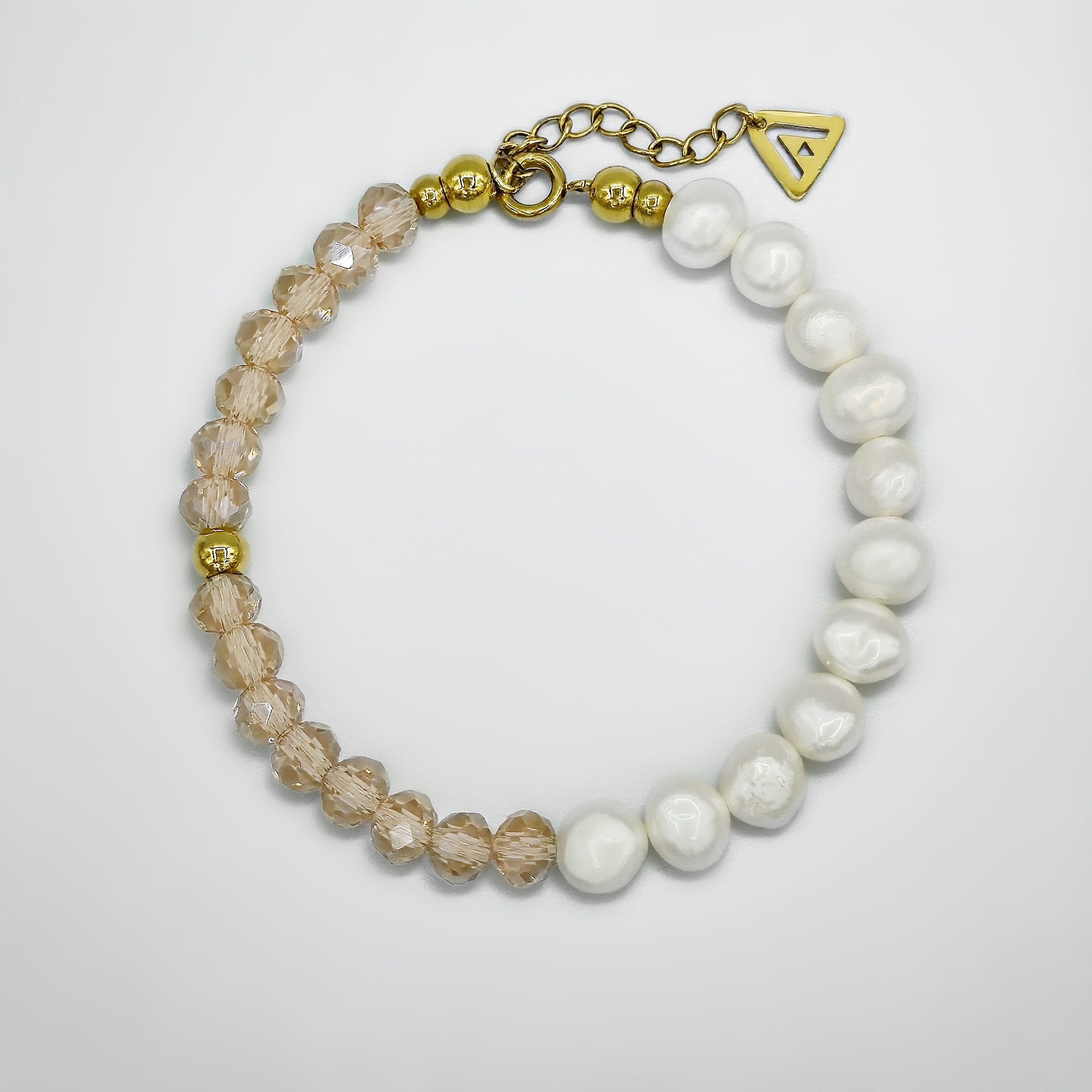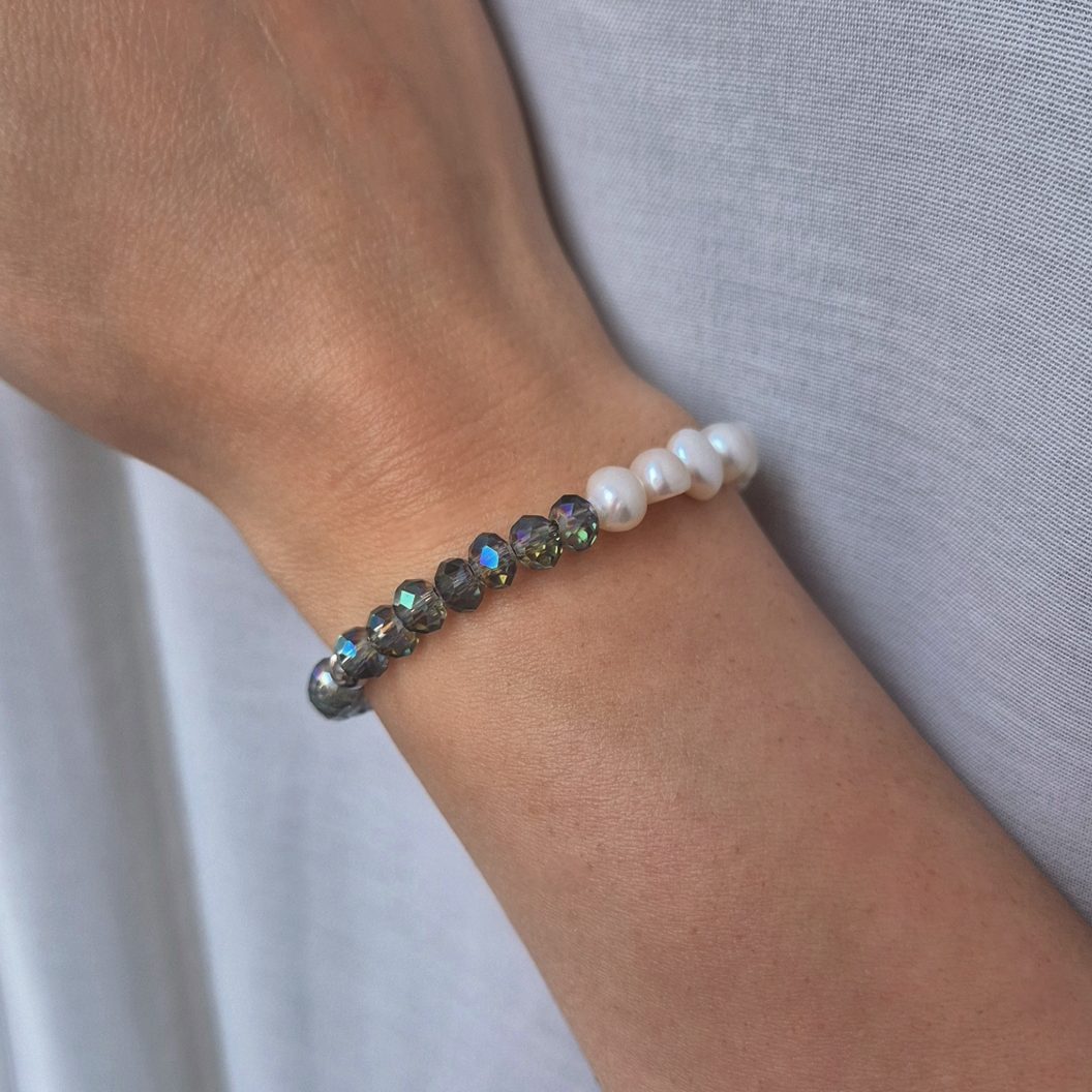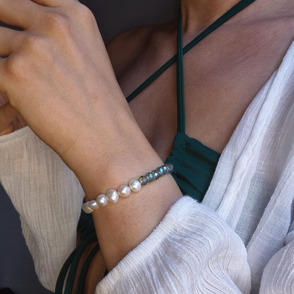 The Half Pearl, Half Crystal Bead Bracelet combines natural freshwater pearls, glass beads, and stainless steel elements. Perfect for both beach and city settings.